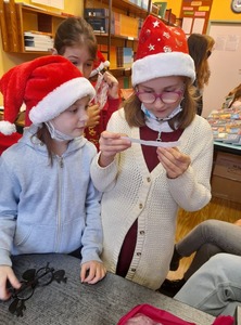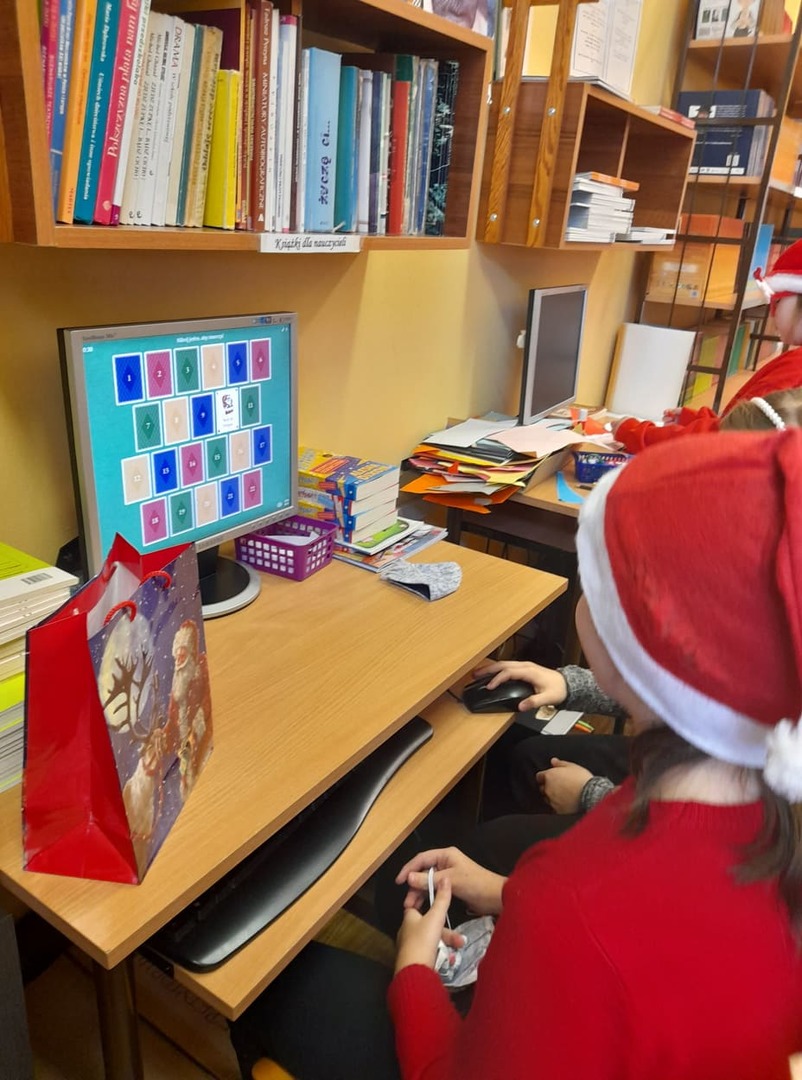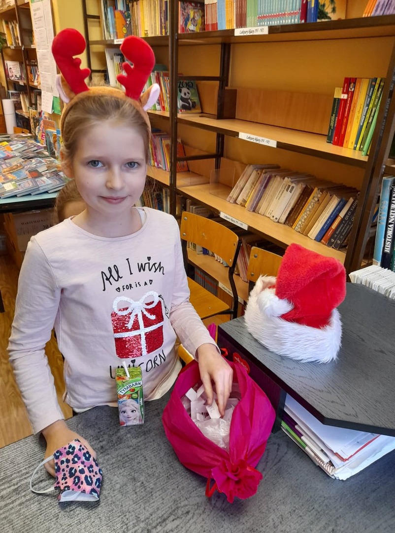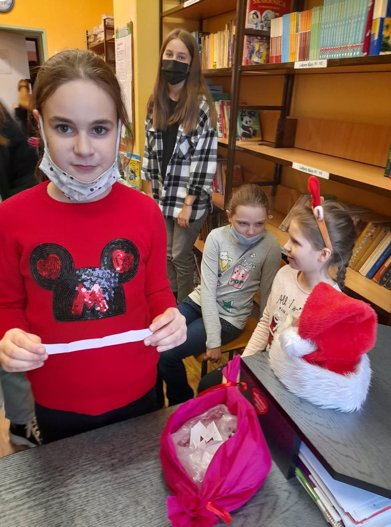 6 grudnia biblioteka szkolna przygotowała dla wszystkich chętnych uczniów mikołajkowy worek rozmaitych zadań. Były do wykonania m.in.: ćwiczenia interaktywne, kolorowanki, czapki mikołajkowe, układano rymowankę, projektowano znaczki Mikołaja oraz czytano ulubione fragmenty książek i spełniano dobre uczynki wobec rówieśników a także dorosłych.