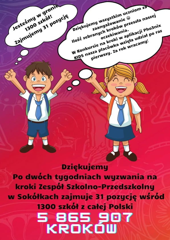 Po dwóch tygodniach rywalizacji zakończył się wielki ogólnopolski konkurs na kroki. Serdecznie dziękujemy wszystkim naszym uczczniom za zaangażowanie! Nasz zespół po raz pierwszy wziął udział w konkursie z aplikacją Pho3nix Kids (i zapewniamy, że nie po raz ostatni), a ilość zebranych kroków przeszła naszej oczekiwania. Spośród 1300 szkół z całej Polski zajmujemy 31 pozycję z łączną liczbą kroków 5 865 907! Konkurs miał na celu wesprzeć fundację WOŚP, a za każde 1000 kroków fundacja Pho3nix na rzecz fundacji WOŚP przekazała 5 zł. Ogromne brawa dla Was, drodzy uczniowie! Bez Was nie byłoby to możliwe. Pamiętajcie, że warto pomagać! To nie koniec naszej przygody z fundacją Pho3nix. Szczegółów nie zdradzimy, ale uważnie śledźcie naszą stronę!