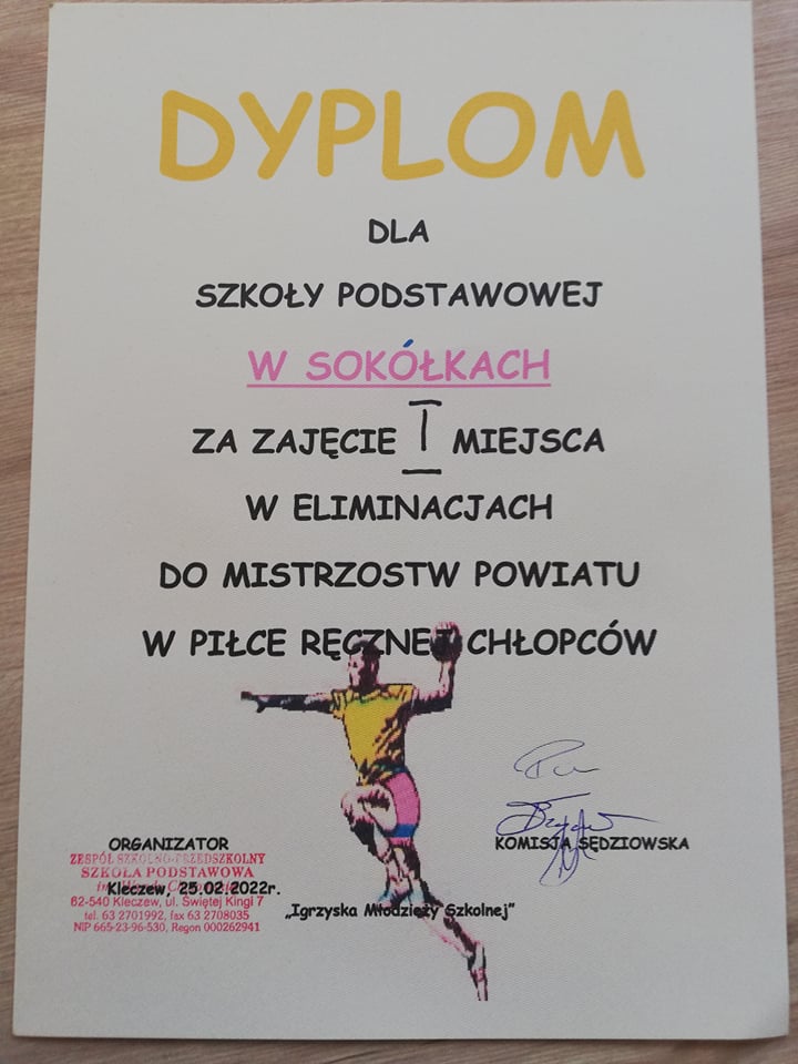 Dnia 25.lutego w Kleczewie odbył się turniej kwalifikacyjny w piłce ręcznej chłopców. Bardzo dobrze spisali się nasi uczniowie zajmując pierwsze miejsce. Szkołę reprezentowali: A. Janiak, W. Jankowiak, A. Topolski, F. Biernat, K. Koprowski, A. Koralewski, M. Tomaszewski, O. Kupsik, I. Szkudelski.