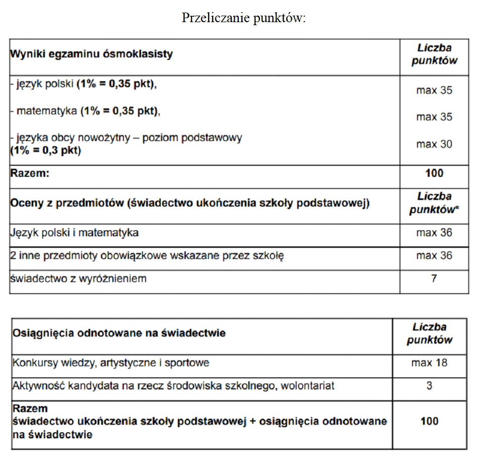 Wytyczne te mogą różnić się, w zależności od wybranej przez ucznia szkoły, dlatego też zachęcamy do zapoznania się z aktualną ofertą edukacyjną szkół ponadpostawowych oraz zasadami rekturacji obowiązującymi w wybranej szkole, które można znaleźć na stronach internetowych placówek.