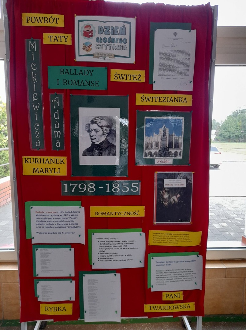 29 września 2022r. obchodziliśmy Dzień Głośnego Czytania połączony z akcją Narodowego Czytania. Czytaliśmy Ballady i romanse Adama Mickiewicza. Tym razem przeznaczyliśmy tydzień na wspólne czytanie wybranej lektury w poszczególnych klasach. Do akcji przyłączyli się zarówno młodsi, jak i starsi uczniowie. Spośród znanych utworów naszego wieszcza narodowego wybrano Powrót taty, Świtezianka, Pani Twardowska. W ramach tej akcji została wykonana gazetka dekoracyjna na korytarzu szkolnym. Udostępniono prezentację multimedialną o życiu i twórczości Adama Mickiewicza.