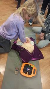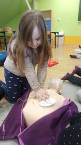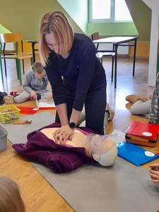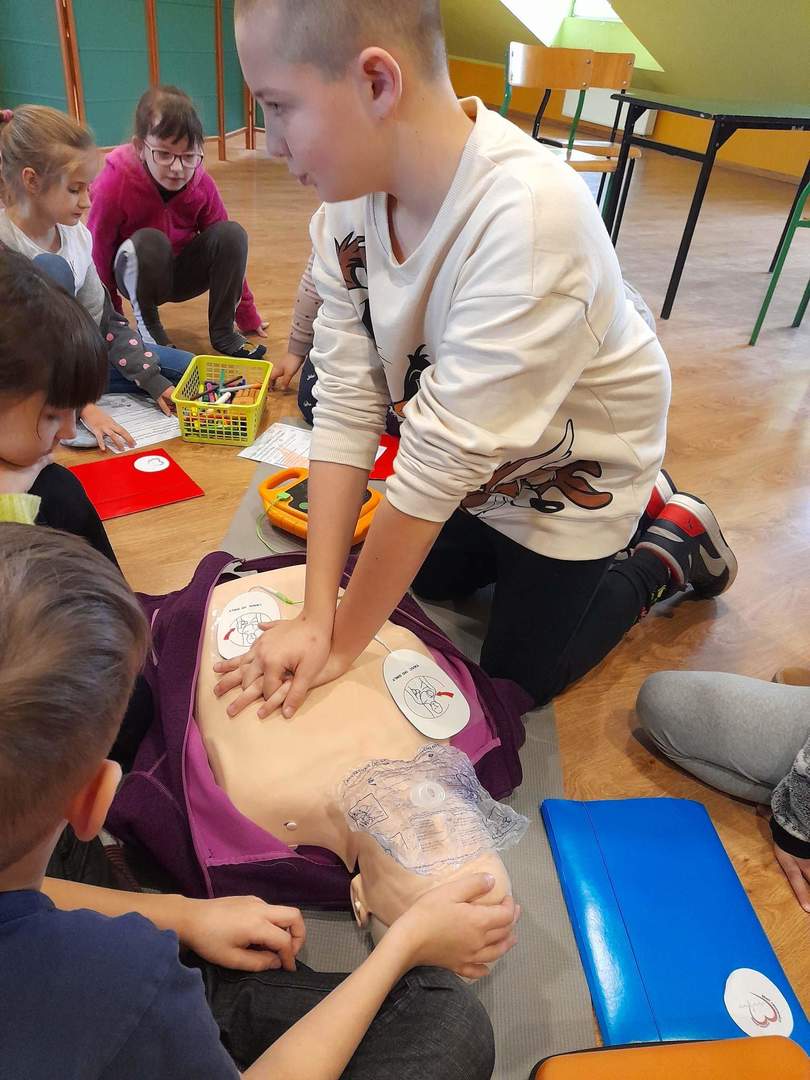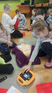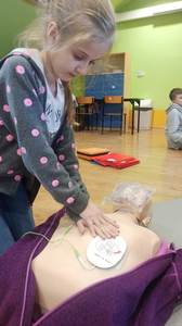 Podczas dzisiejszych zajęć uczniowie uczyli się jak prawidłowo użyć automatycznego defibrylatora (AED) w pierwszych minutach po rozpoznaniu nagłego zatrzymania krążenia. Uruchomienie i wykonywanie poleceń AED zwiększa szanse poszkodowanego na przeżycie.