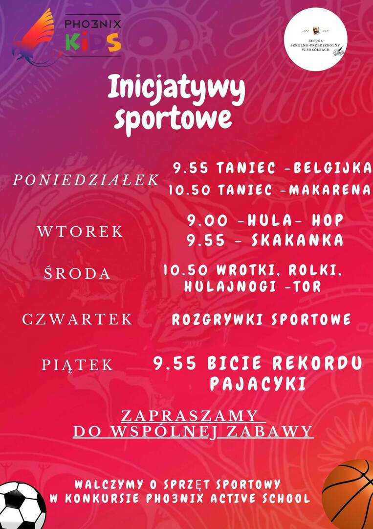 W tym tygodniu na naszych uczniów czekają inicjatywy sportowe w ramach konkursu Pho3nix Active School. Kwiecień jest miesiącem zdrowia. Zatem drodzy Uczniowie, zapraszamy do wspólnej zabawy! Prosimy, aby uczniowie w te dni w miarę możliwości mieli ze sobą hula hop, skakanki, rolki, wrotki, hulajnogi, kaski i ochraniacze.