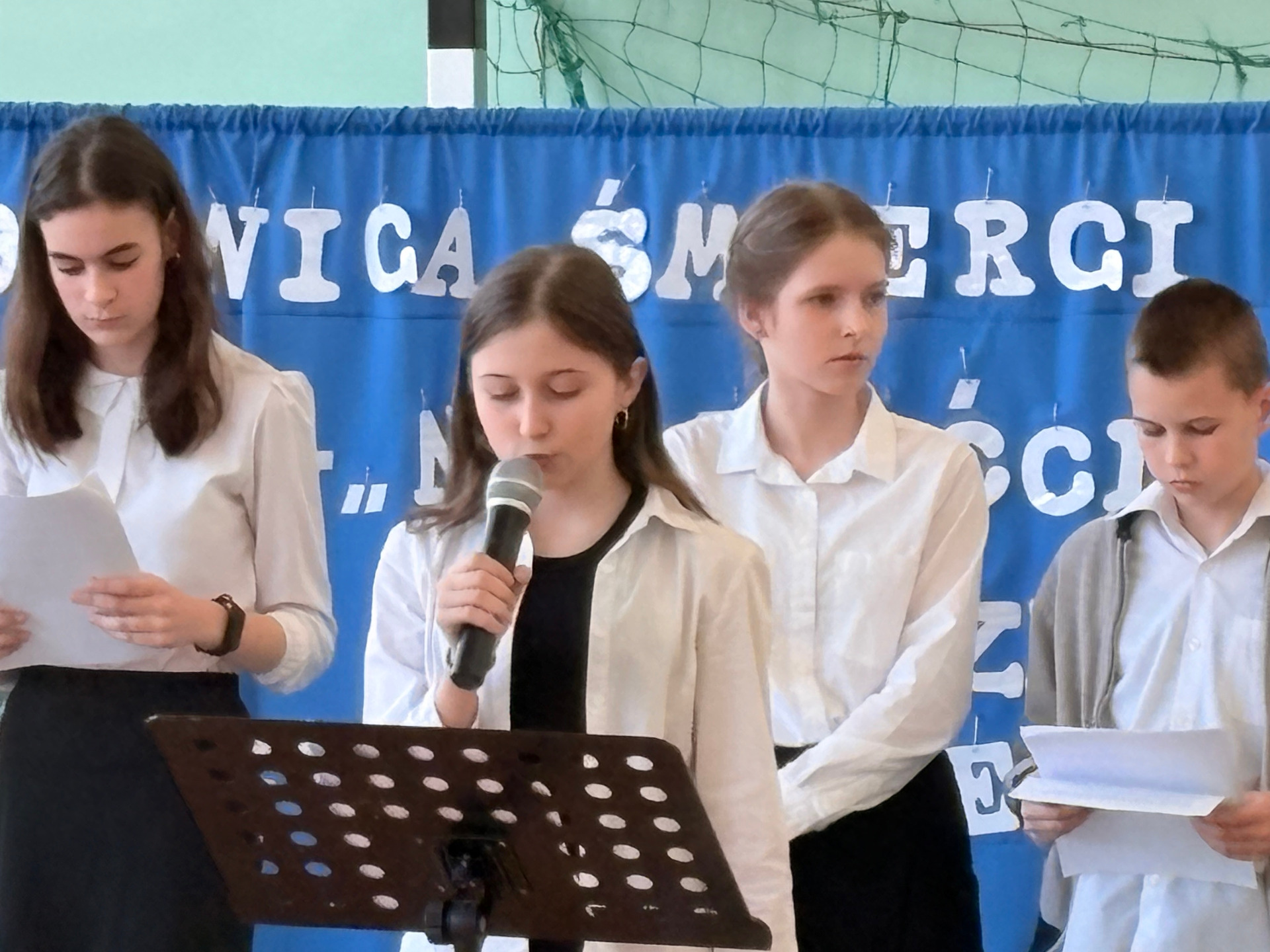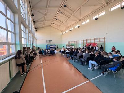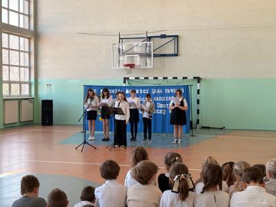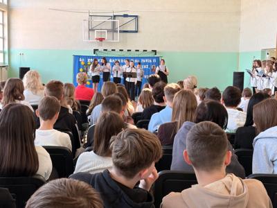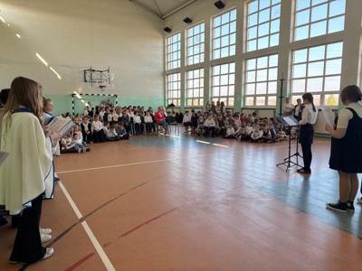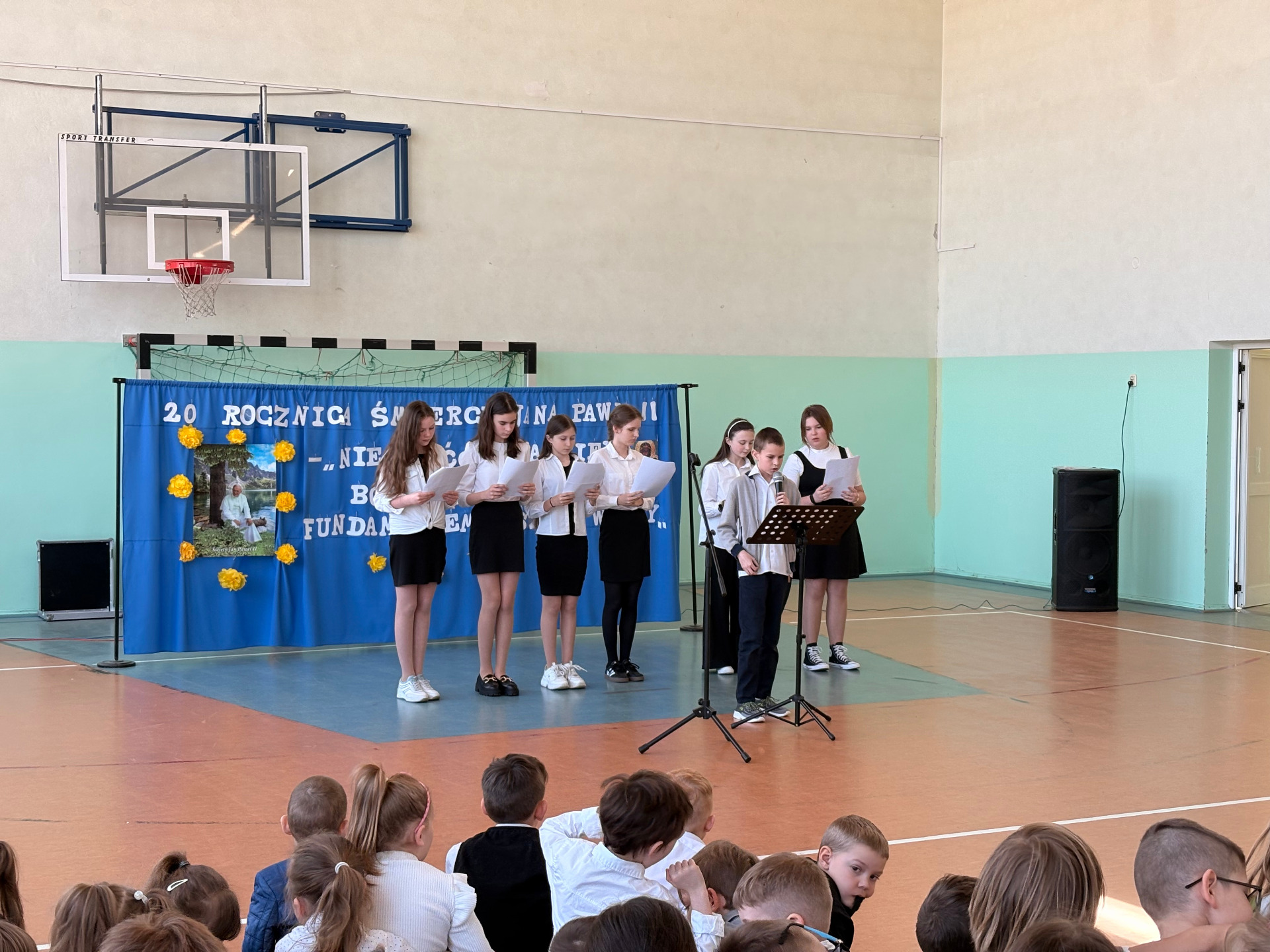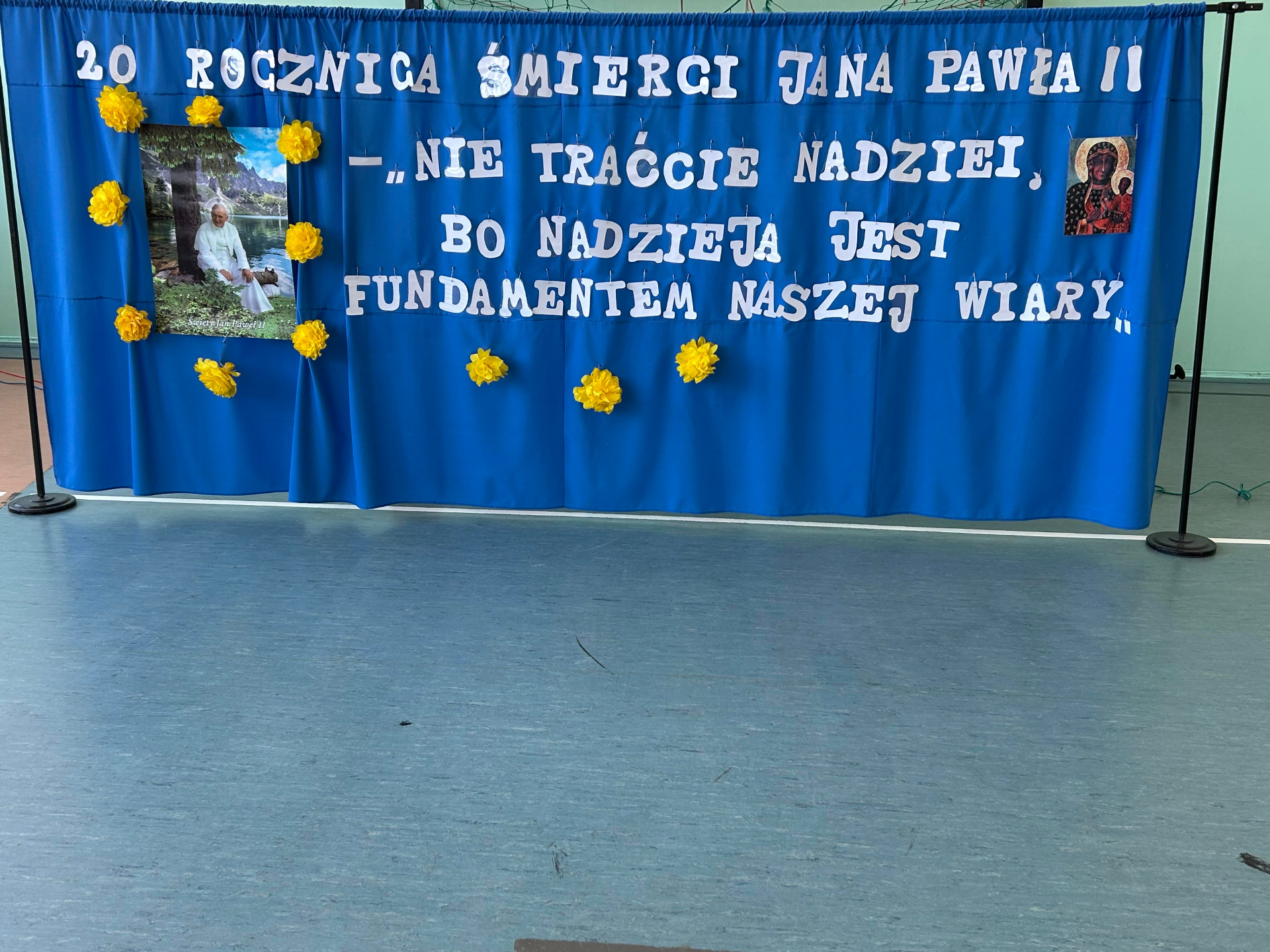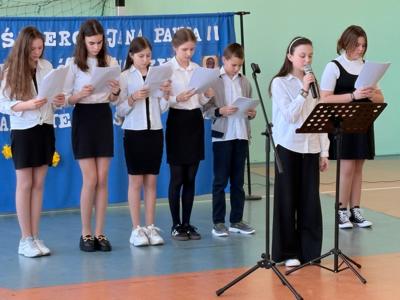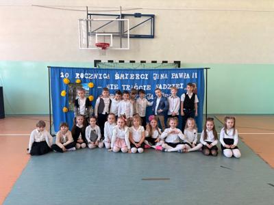 Dwudziestą rocznicę śmierci św. Jana Pawła II uczciliśmy uroczystym apelem. Uczniowie wraz z chórem szkolnym oraz na tle pięknej dekoracji przedstawili najważniejsze wydarzenia z życia Papieża Polaka .