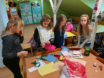 Zbliżają się Święta Bożego Narodzenia. Świetliczaki wraz z paniami wykonują prace plastyczne związanez tą tematyką. Mamy już mikołaje, renifery, aniołki, gwiazdeczki, śnieżynki i papierowe choineczki. Prace te stanowią wspaniałą dekorację naszej świetlicy. Wprowadzają nas w świąteczny nastrój. Zostały także ogłoszone konkursy świetlicowe pod hasłem: „Portret Mikołaja” i „Kartka świąteczna”. Chcemy się wszystkim pochwalić tymi pracami. Czeka nas jeszcze wspólne ubieranie choinki.