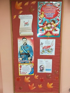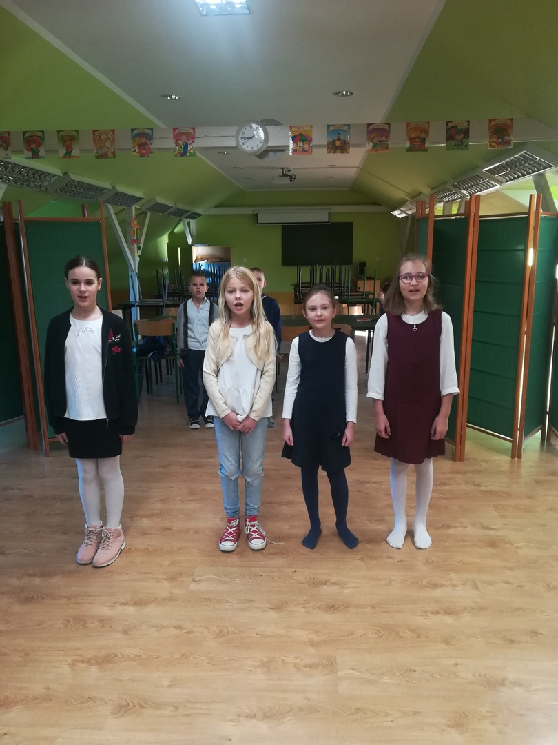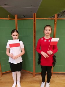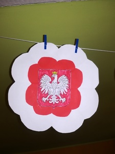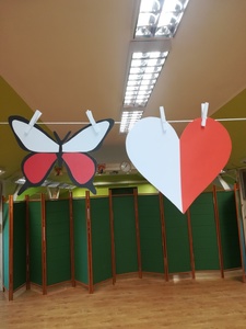 m.in. biało-czerwone serca, motyle, kotyliony i flagi. Wykonana została również gazetka tematyczna. Włączyliśmy się także w Akcję „Szkoła do Hymnu”. Wspólnie odśpiewaliśmy Mazurka Dąbrowskiego, słuchaliśmy i śpiewaliśmy pieśni patriotyczne.