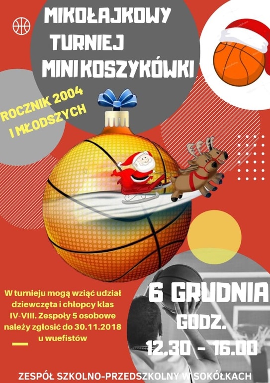 6 grudnia 2018r. w Zespole Szkolno-Przedszkolnym w Sokółkach odbędzie się Mikołajkowy Turniej Minikoszykówki chłopców i dziewcząt z klas IV-VIII. Organizatorami turnieju są nauczyciele wychowania fizycznego oraz dyrektor placówki. Rozpoczęcie turnieju zaplanowane jest na godzinę 12:30 i trwać będzie do godziny 16:00. W turnieju mogą wziąć udział zarówno dziewczęta jak i chłopcy z klas IV-VIII. nauczycieli wychowania fizycznego. W turnieju przewidziana jest jedna nagroda Fair Play. Trzy najlepsze drużny zostaną nagrodzone dyplomami. Na wszystkich czeka słodki poczęstunek. W tym dniu będzie liczyłasię zdrowa sportowa rywalizacja i dobra zabawa.