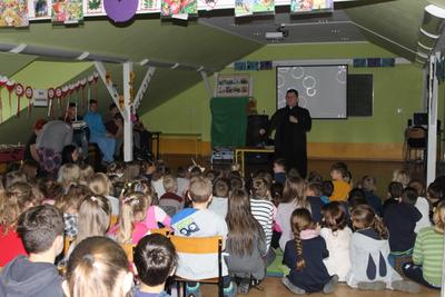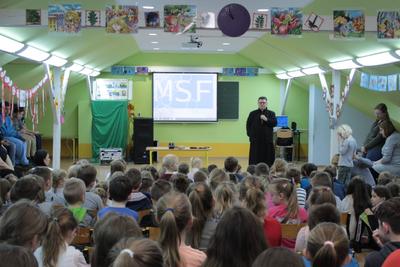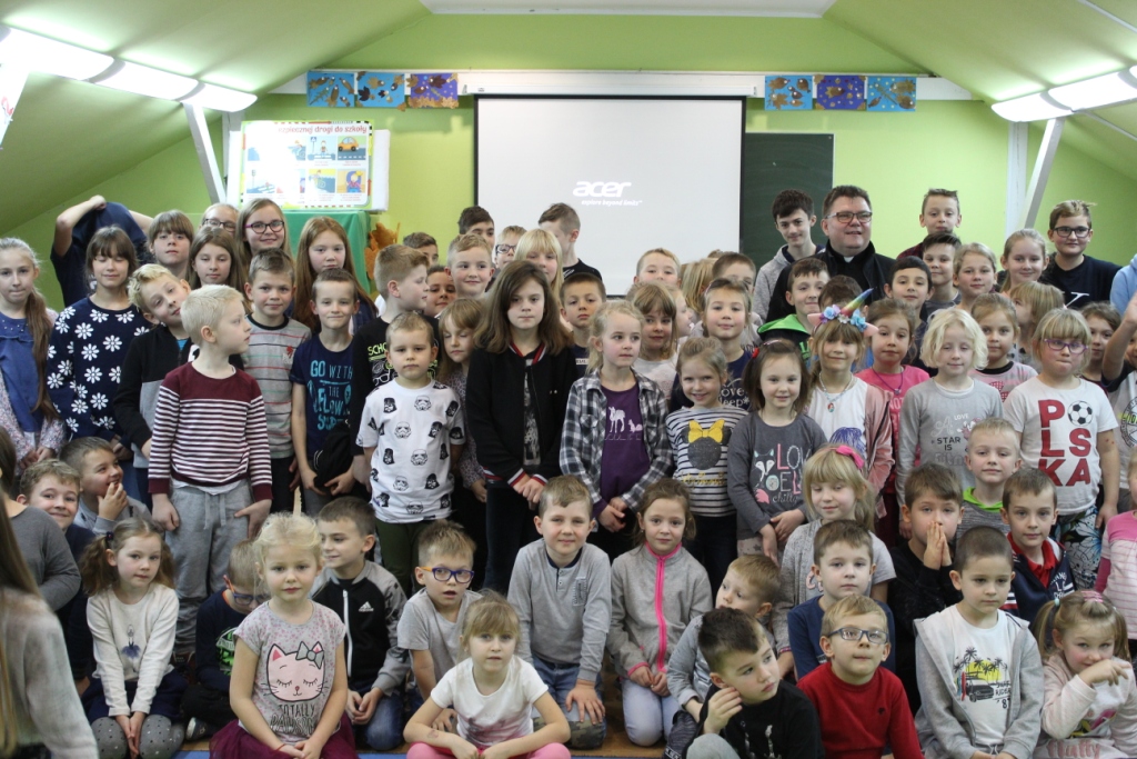W naszej szkole dzieje się bardzo wiele... Odwiedzają nas również niezwykli goście. Tym razem zawitał w nasze progi Misjonarz Świętej Rodziny z Kazimierza Biskupiego - ks. dr Adam Bajorski. Jego opowieściom przysłuchiwaliśmy się z zapartym tchem. Dowiedzieliśmy się, jak powstał klasztor w Kazimierzu, a także obejrzeliśmy krótki film przedstawiający pracę misjonarzy i usłyszeliśmy o wyjątkowych misjonarzach i ich przygodach. Były to niezwykłe historie. Dowiedzieliśmy się również, że nasz gość był w Papui Nowej Gwinei. Ciekawostki, które nam zdradził były niesamowite. Mamy nadzieję, że to nie ostatnia wizyta księdza misjonarza w naszych szkolnych progach. Dziękujemy!